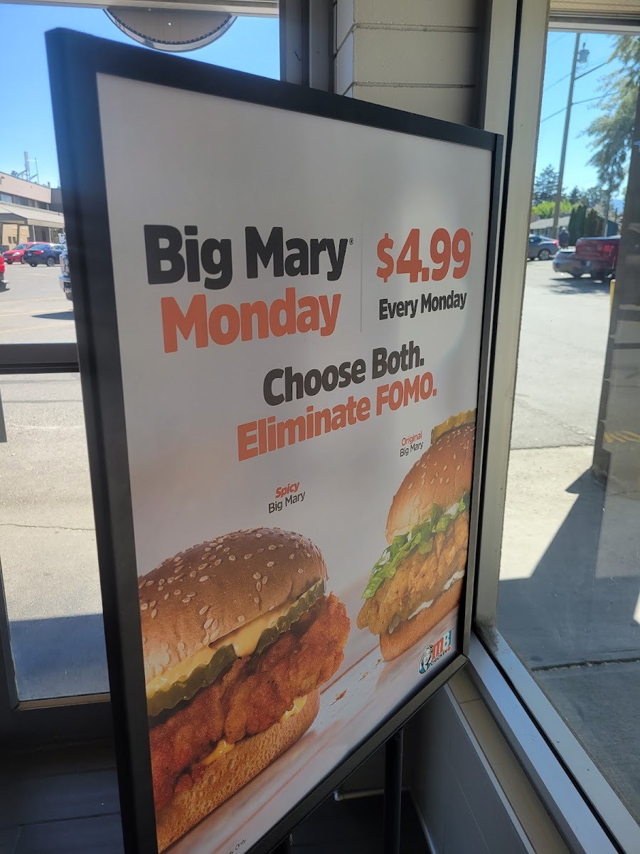 A Spicy Big Mary sandwich with your choice of small taters or fries and a can of pop. 1070-1130 cal.