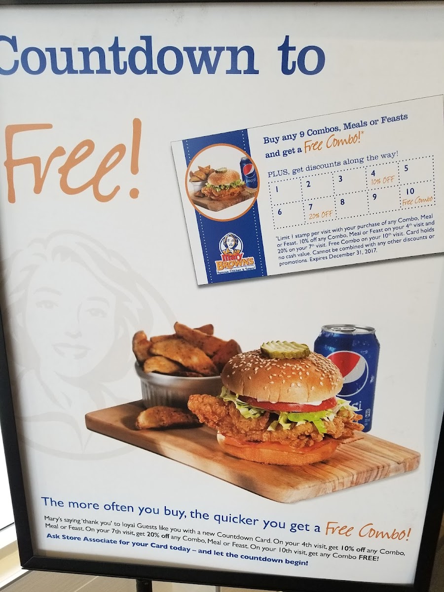 Mary Brown's signature chicken sandwich with your choice of small taters or fries and a can of pop. 830-1210 cal.